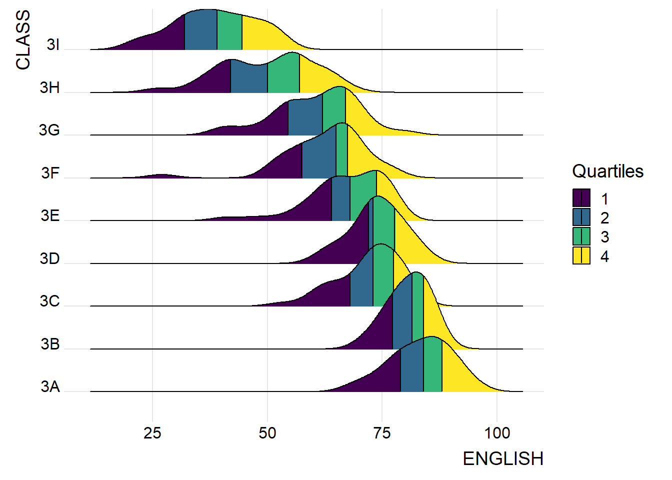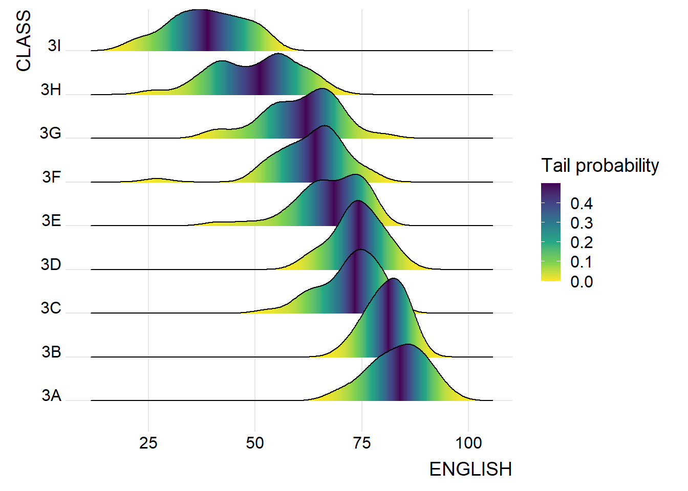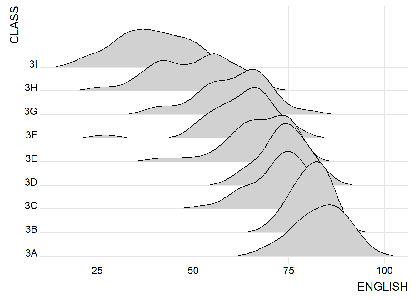 Figure below is a ridgelines plot showing the distribution of English score by class.