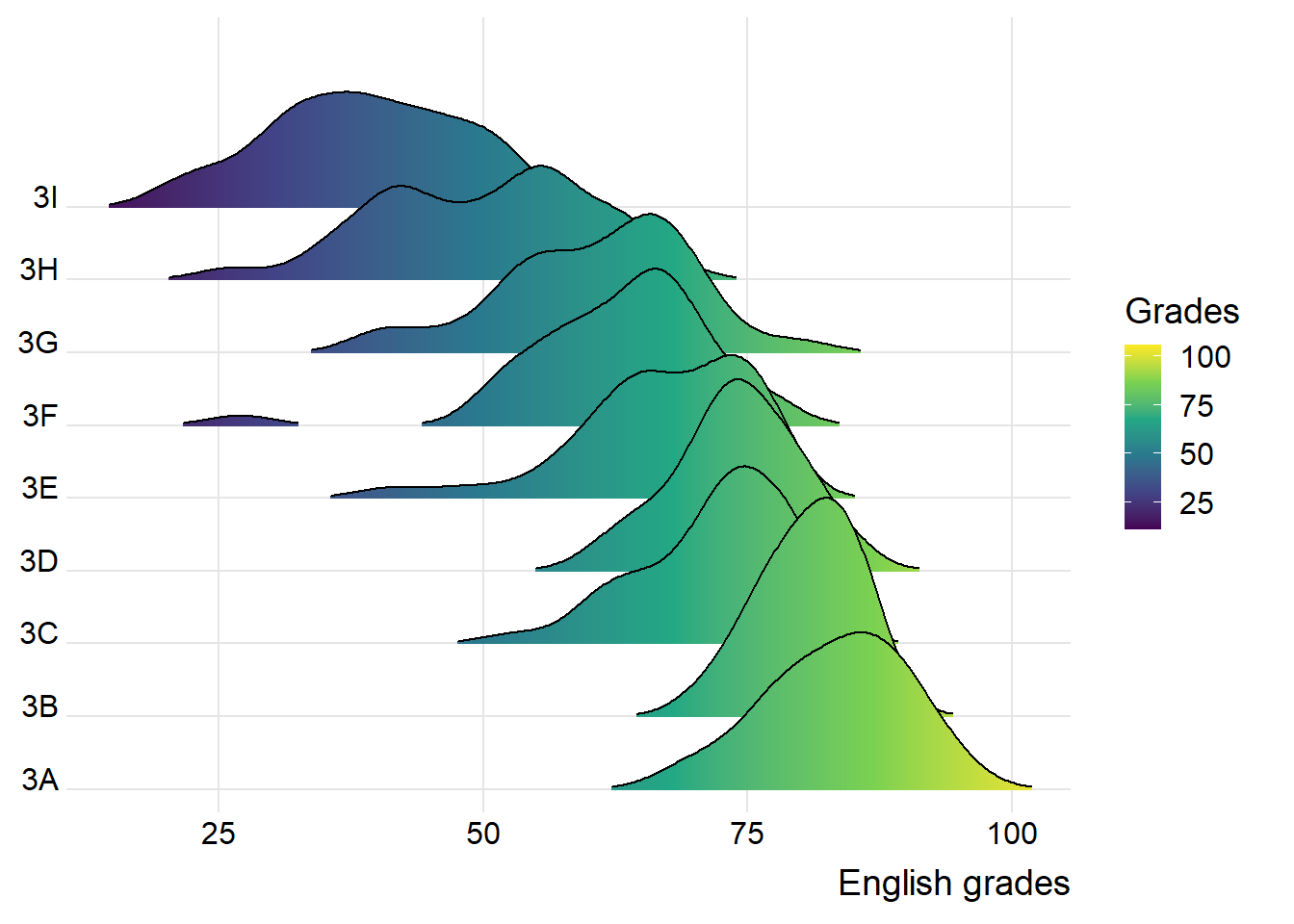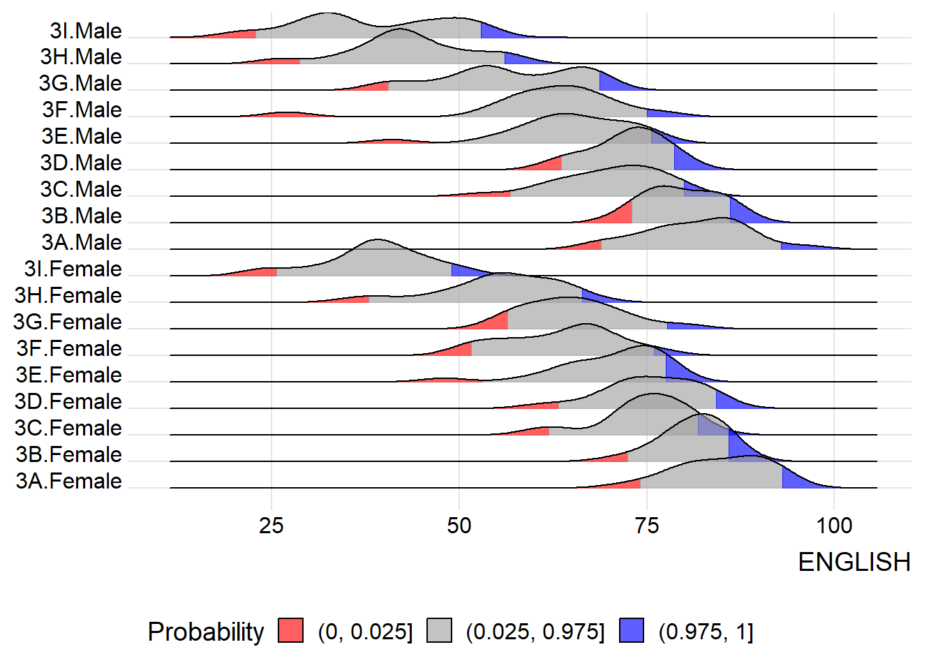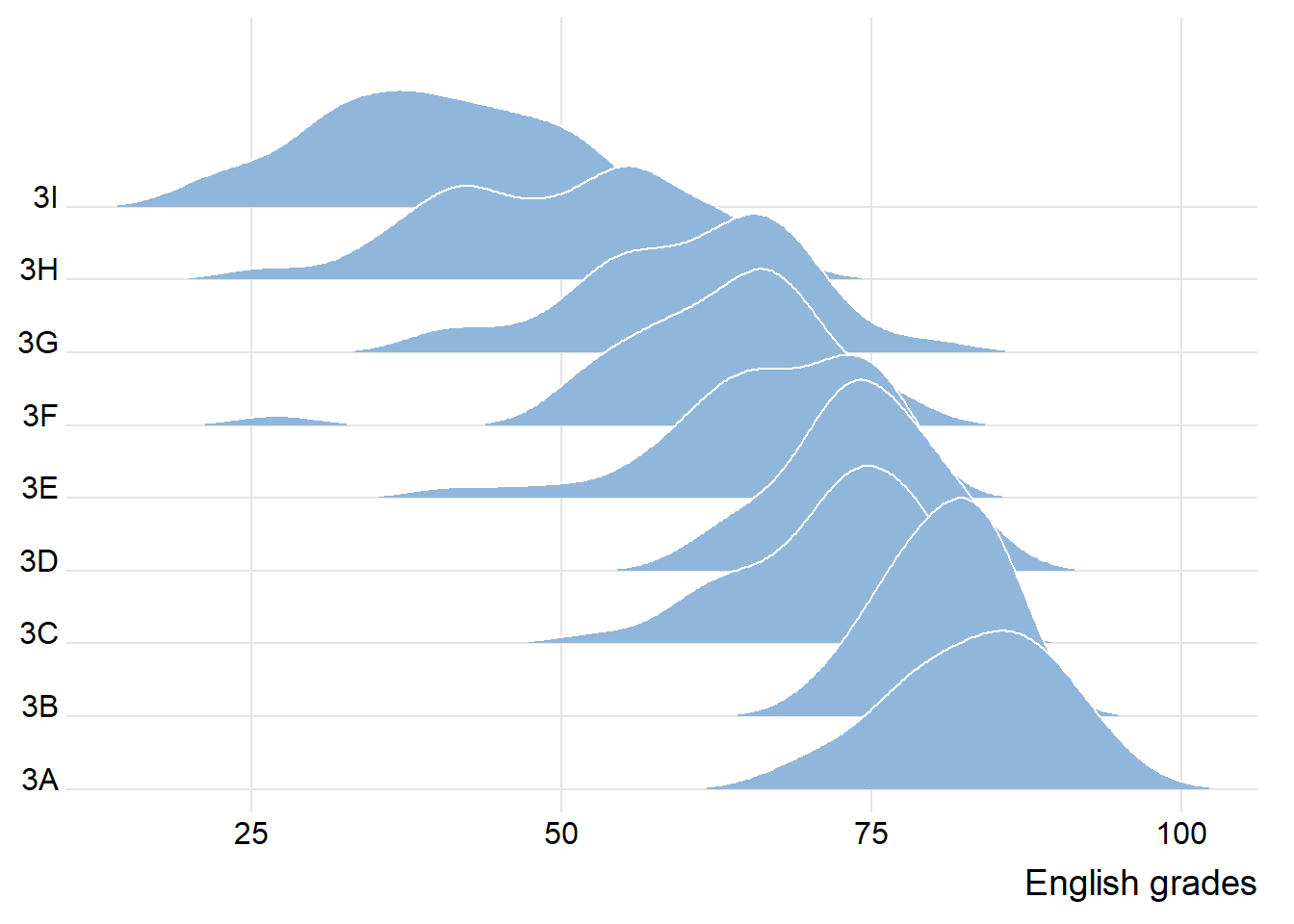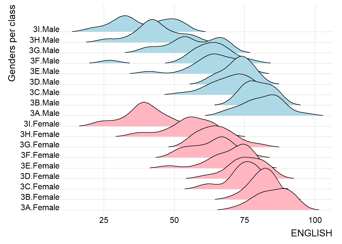 Figure below is a ridgelines plot showing the distribution of English score by class.