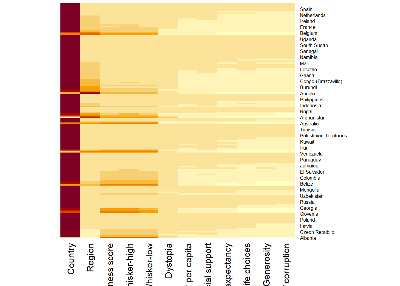 Here, red cells denotes small values, and red small ones. This heatmap is not really informative. Indeed, the Happiness Score variable have relatively higher values, what makes that the other variables with small values all look the same. Thus, we need to normalize this matrix. This is done using the scale argument. It can be applied to rows or to columns following your needs.