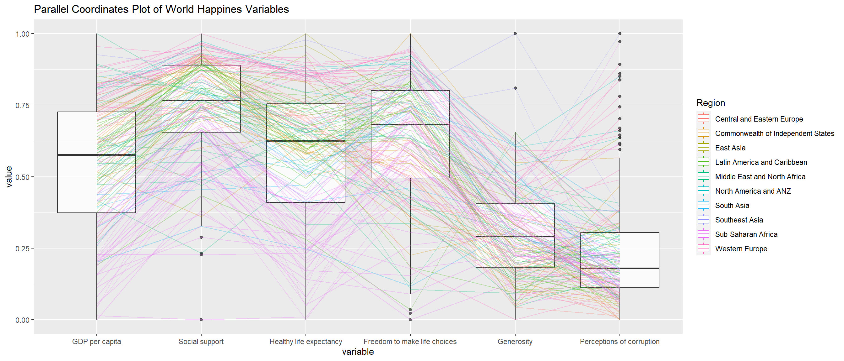 title = "Multiple Parallel Coordinates Plots of World Happines Variables by Region") +