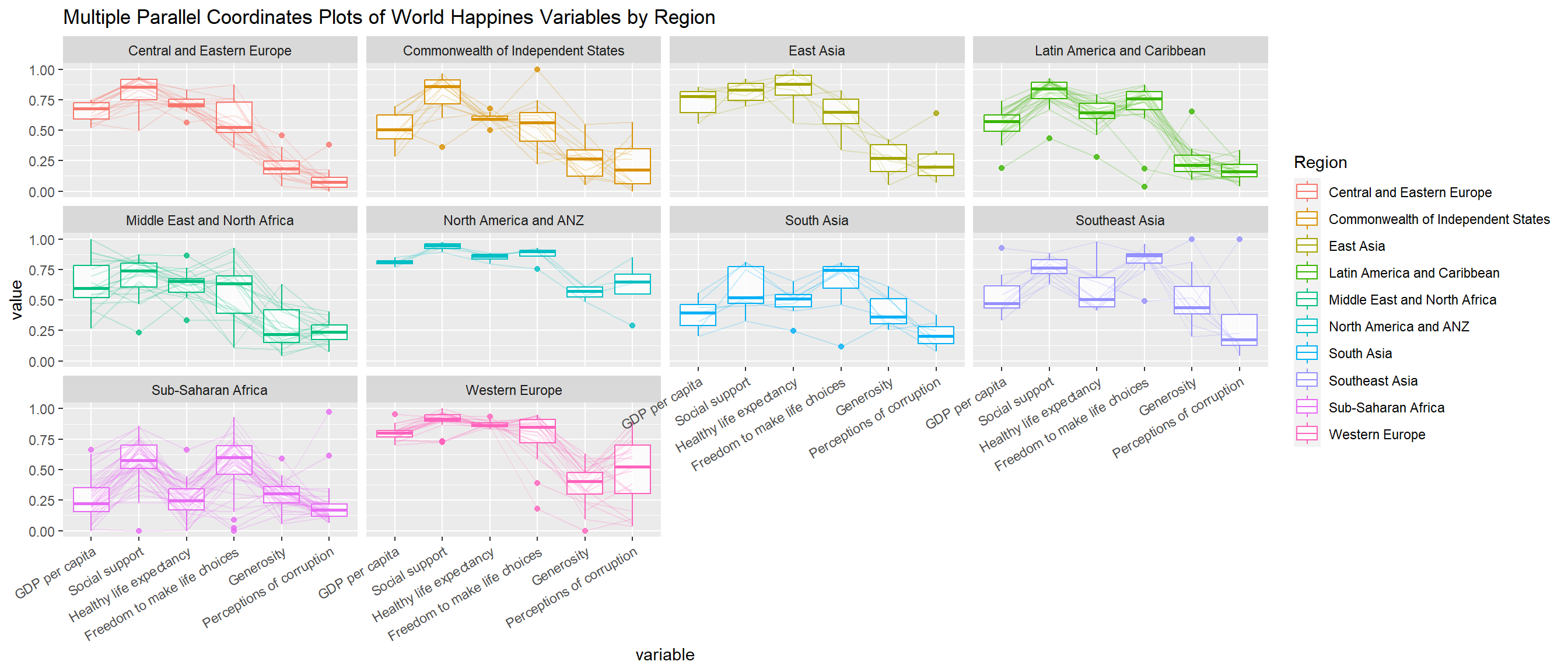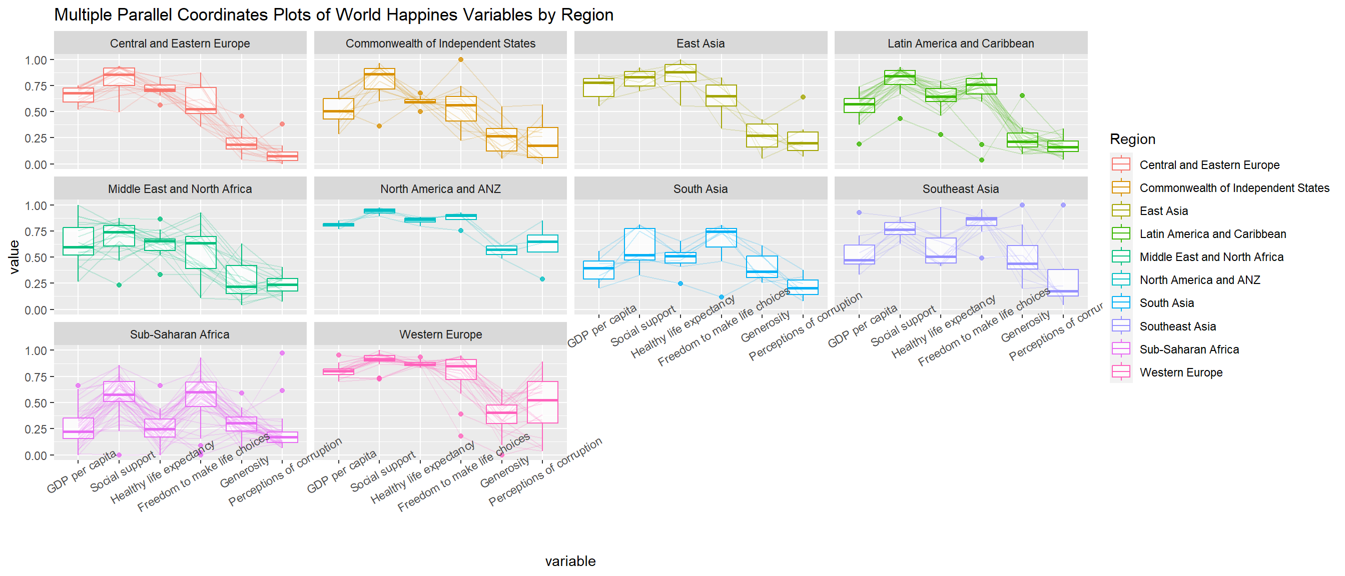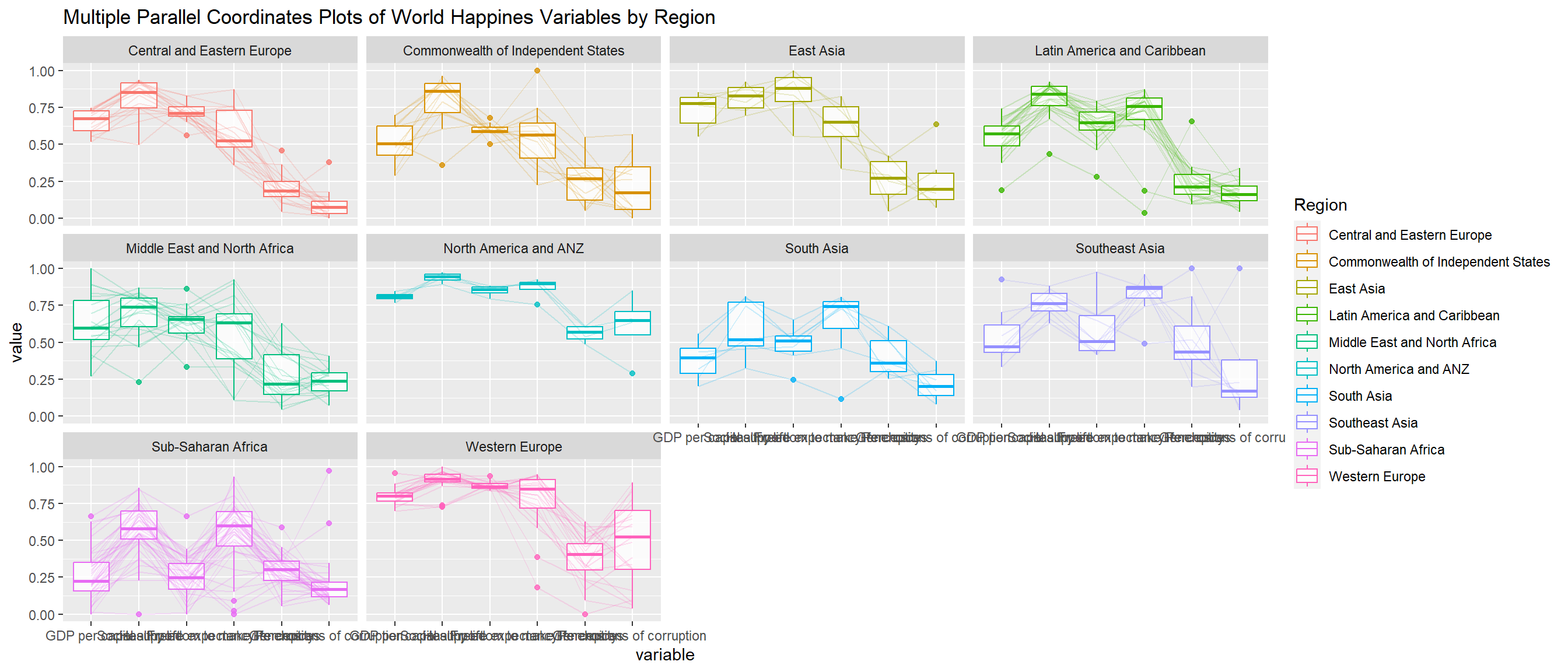In the code below, facet_wrap() of ggplot2 is used to plot 10 small multiple parallel coordinates plots. Each plot represent one geographical region such as East Asia.