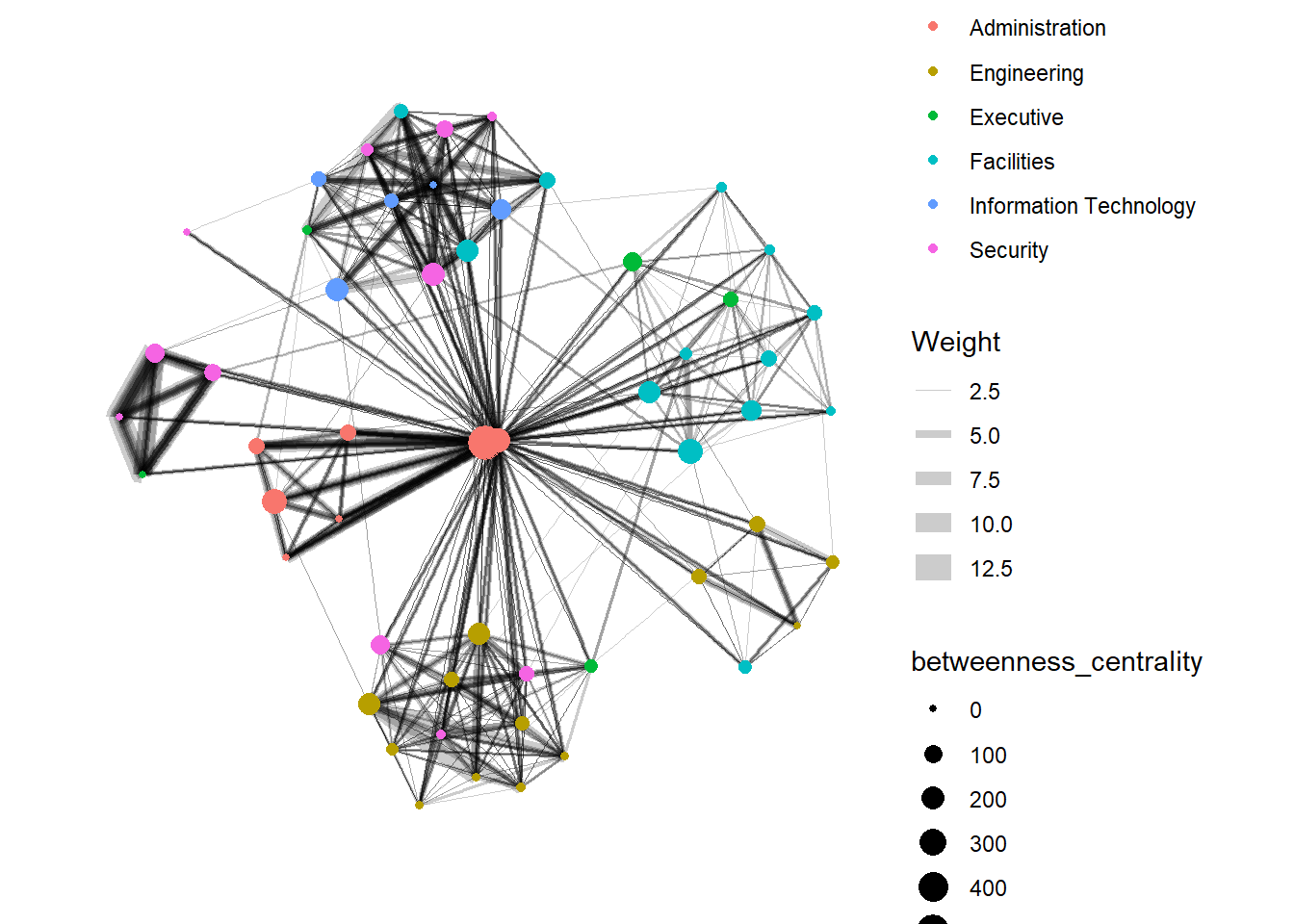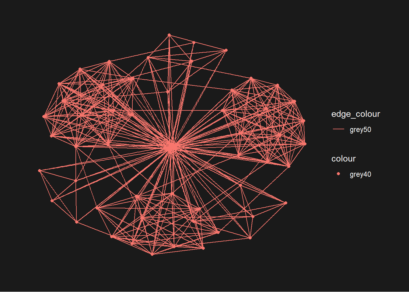 - geom_node_point is equivalent in functionality to geo_point of ggplot2. It allows for simple plotting of nodes in different shapes, colours and sizes. In the codes chnuks above colour and size are used.