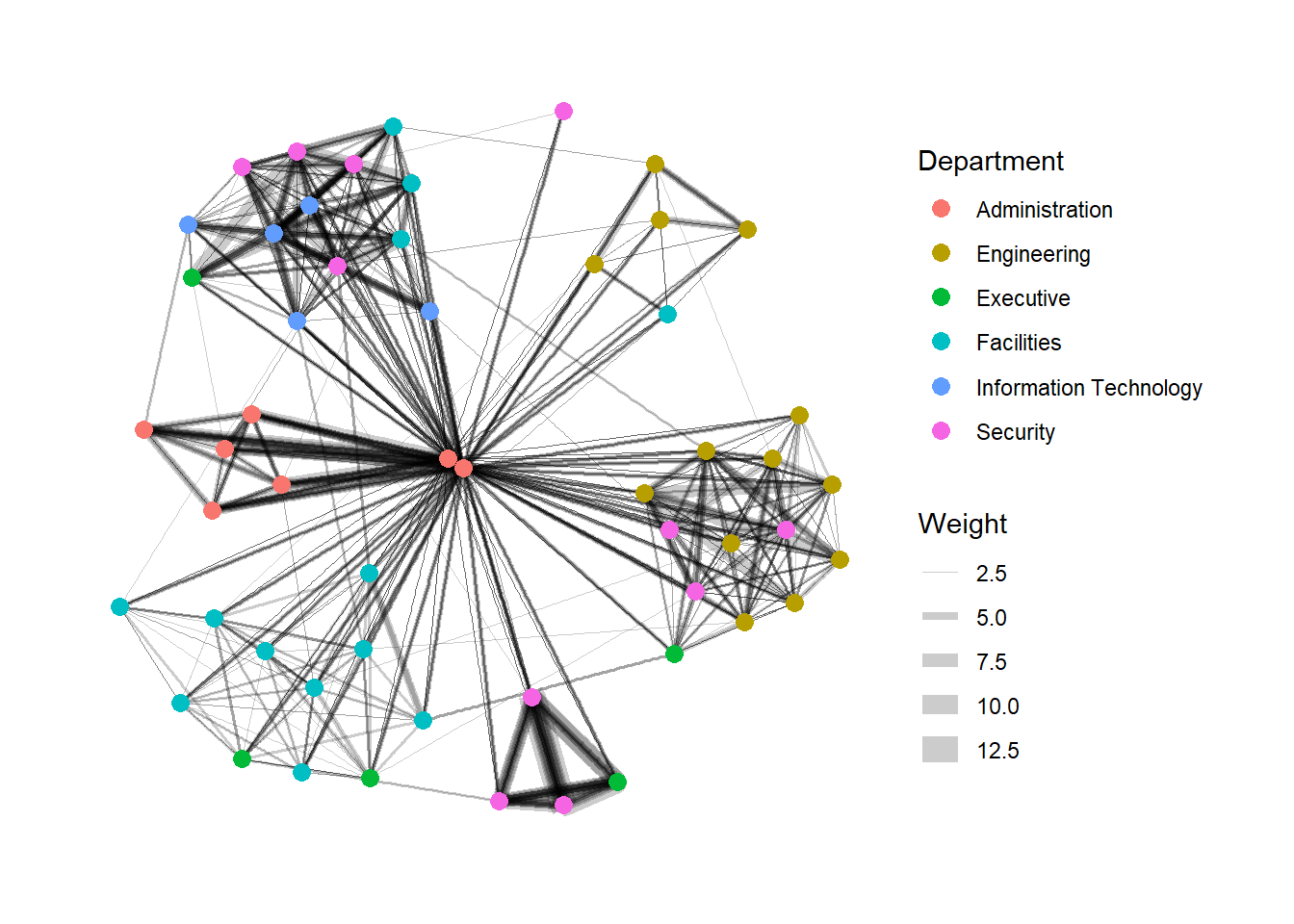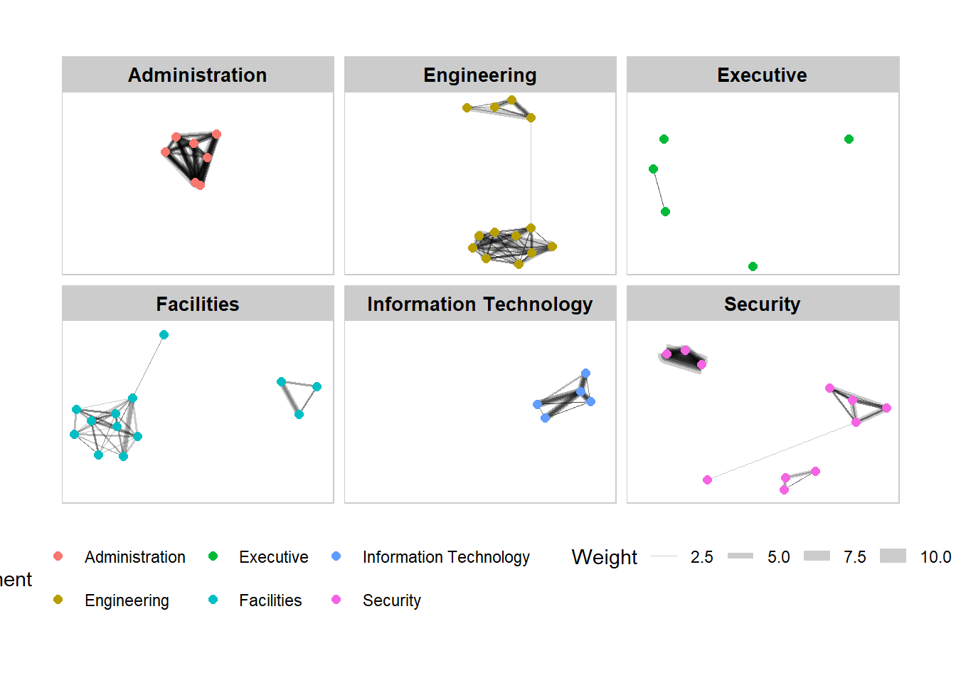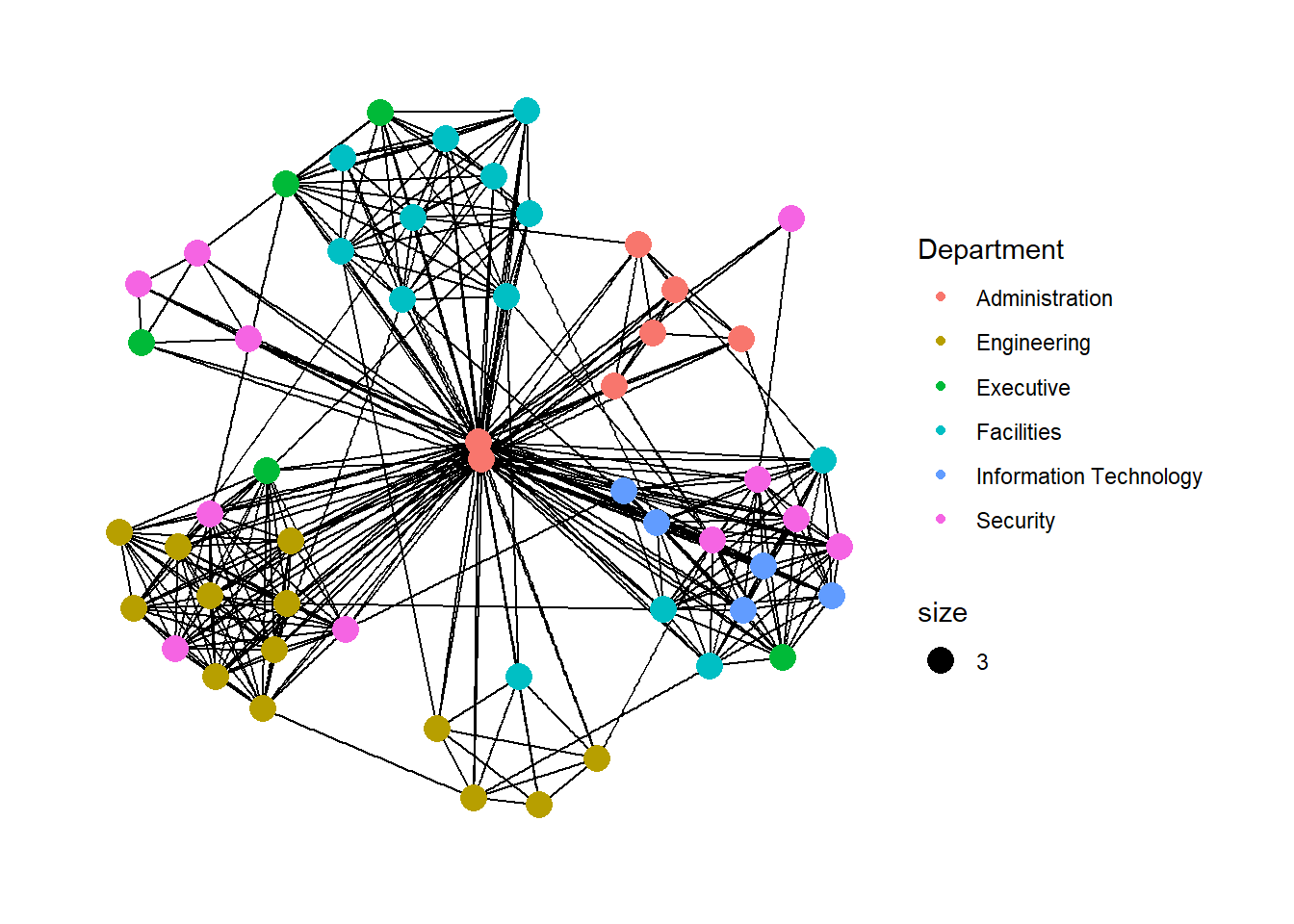 rename(group = Department) When we rerun the code chunk below, visNetwork shades the nodes by assigning unique colour to each category in the group field.