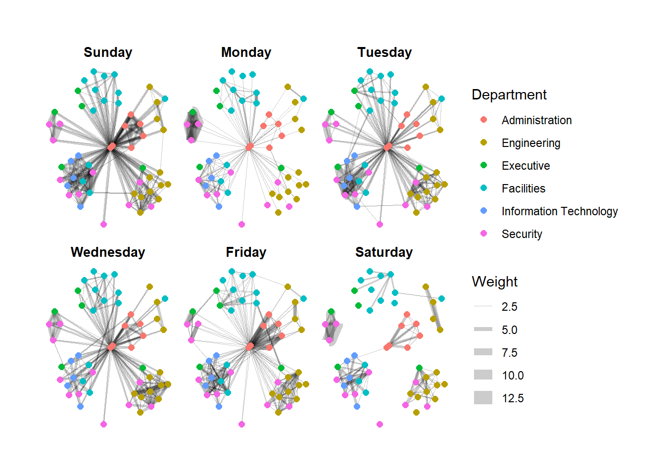 - GAStech-email_edges.csv which consists of two weeks of 9063 emails correspondances between 55 employees.