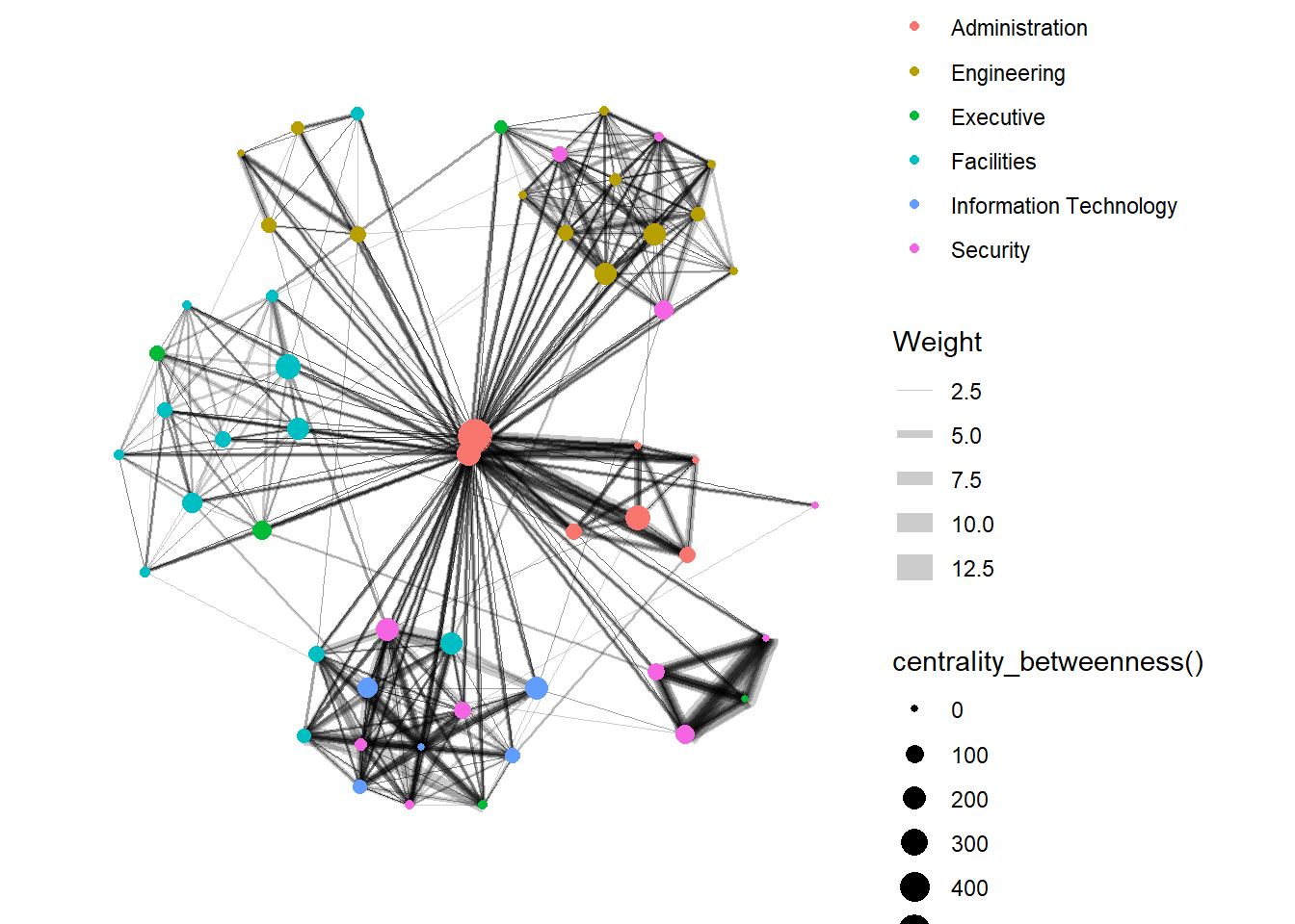 It is important to note that from ggraph v2.0 onward tidygraph algorithms such as centrality measures can be accessed directly in ggraph calls. This means that it is no longer necessary to precompute and store derived node and edge centrality measures on the graph in order to use them in a plot.
