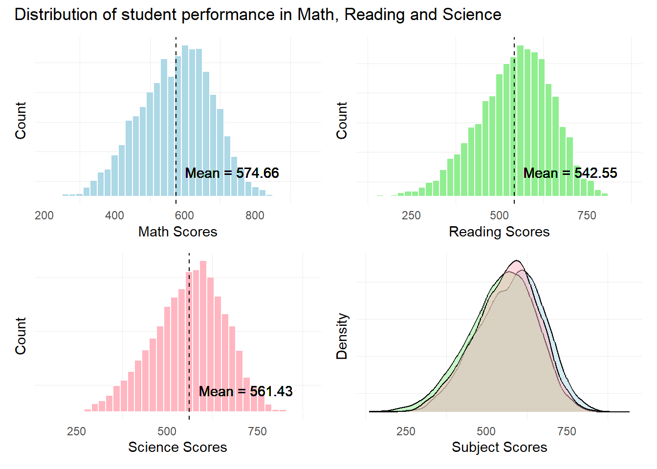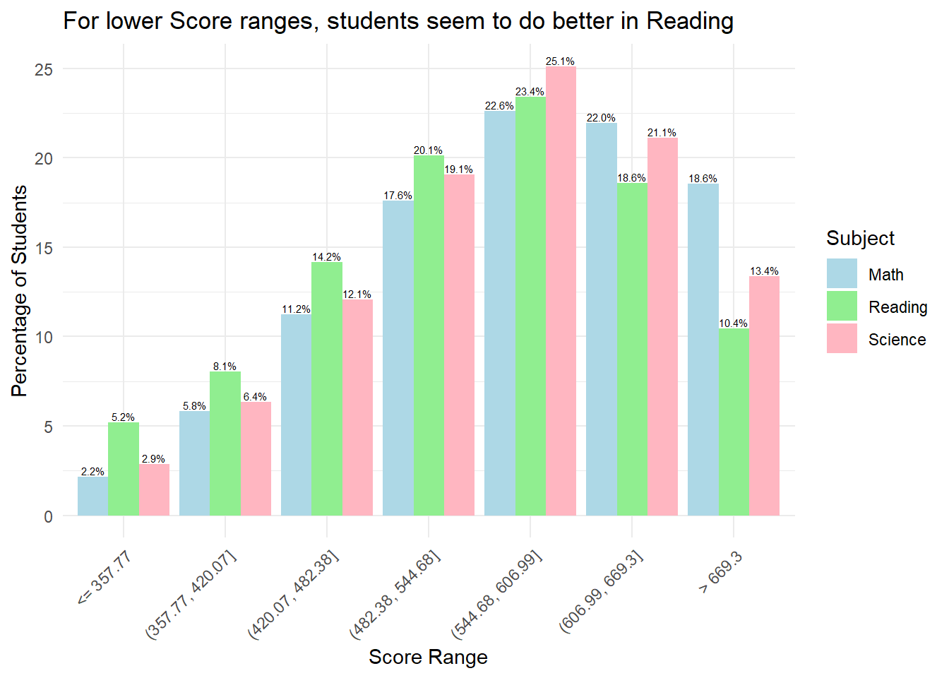 Combined bar plots can allow us to obtain insights on relative performance. For example, for scores below 544.68, we can see that at lower score ranges, students seem to do better in Reading relative to Math and Science. However, at higher score ranges, students do worse in Reading relative to Math and Science.