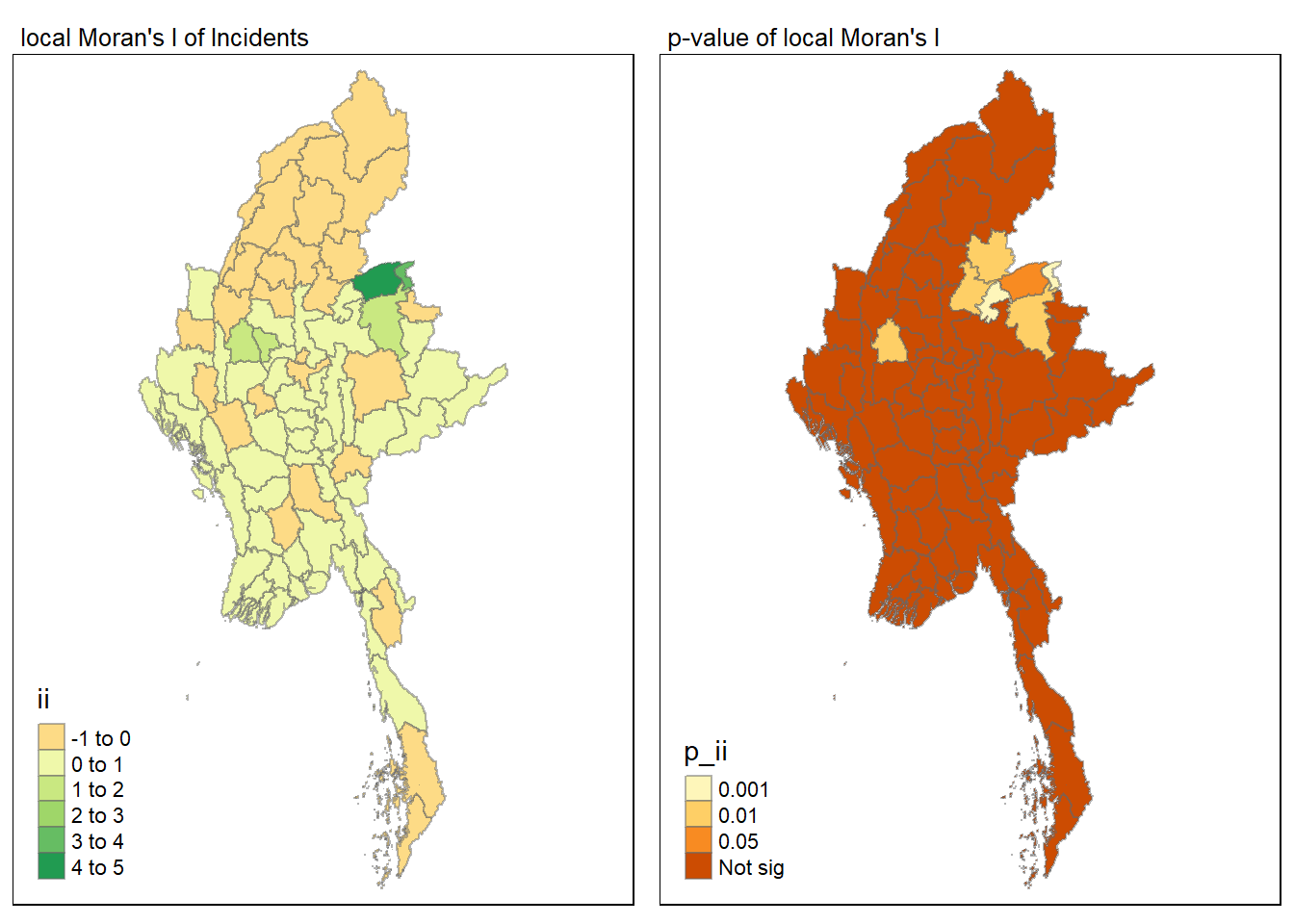 Visuaising local Moran’s I and p-value