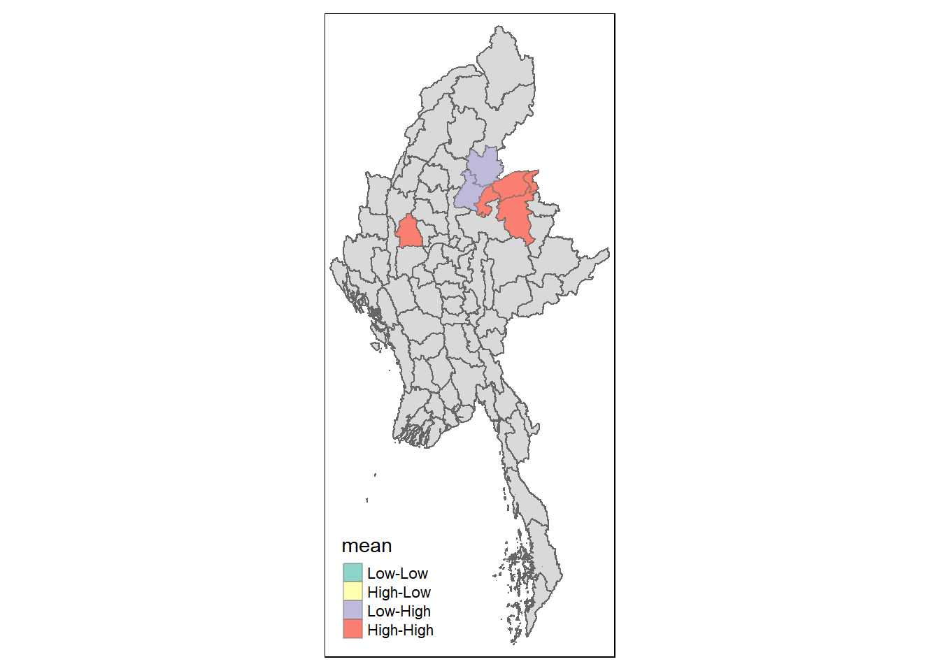 LISA map is a categorical map showing outliers and clusters. There are two types of outliers namely: High-Low and Low-High outliers. Likewise, there are two type of clusters namely: High-High and Low-Low clusters. LISA map is an interpreted map by combining local Moran’s I of geographical areas and their respective p-values.