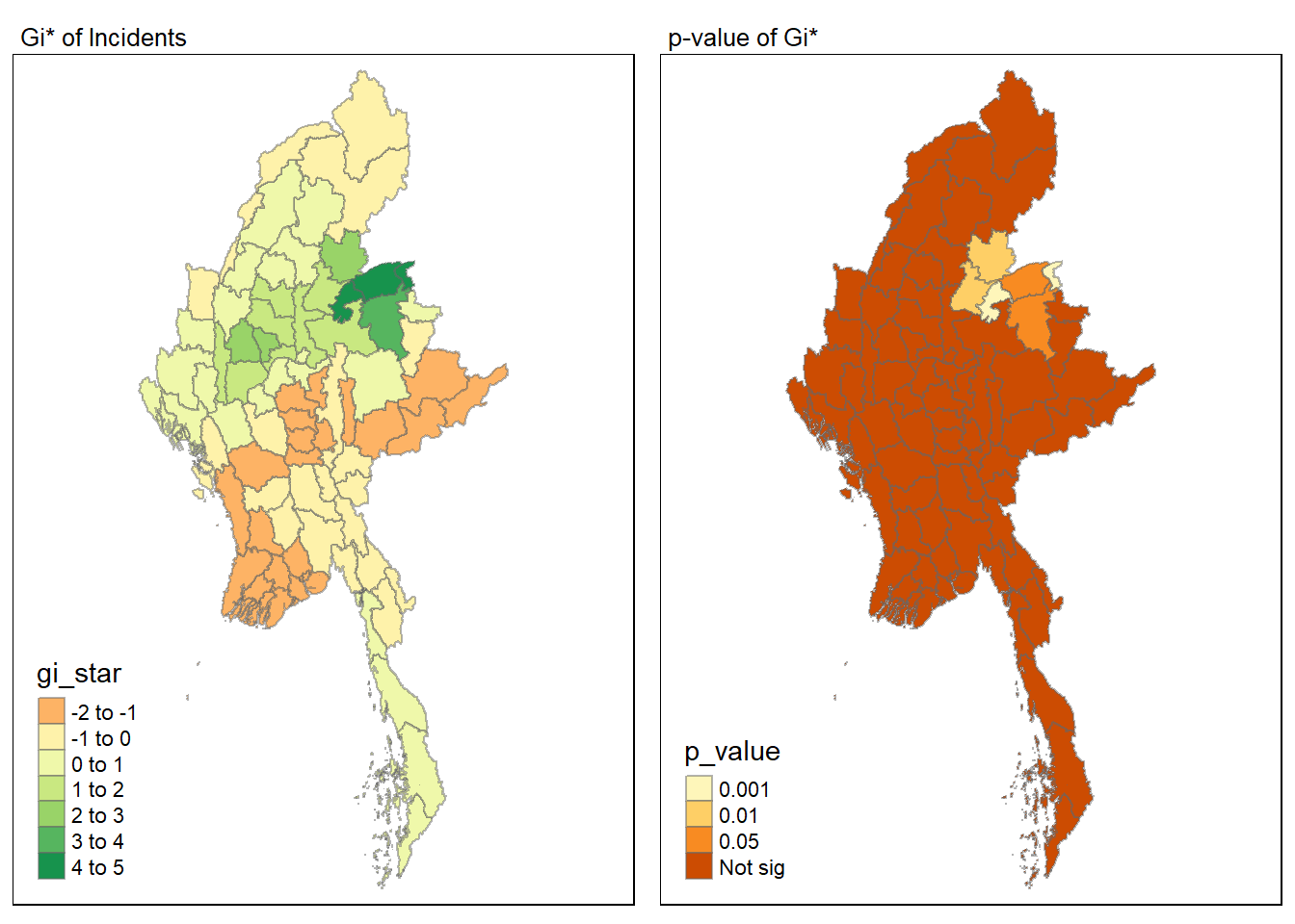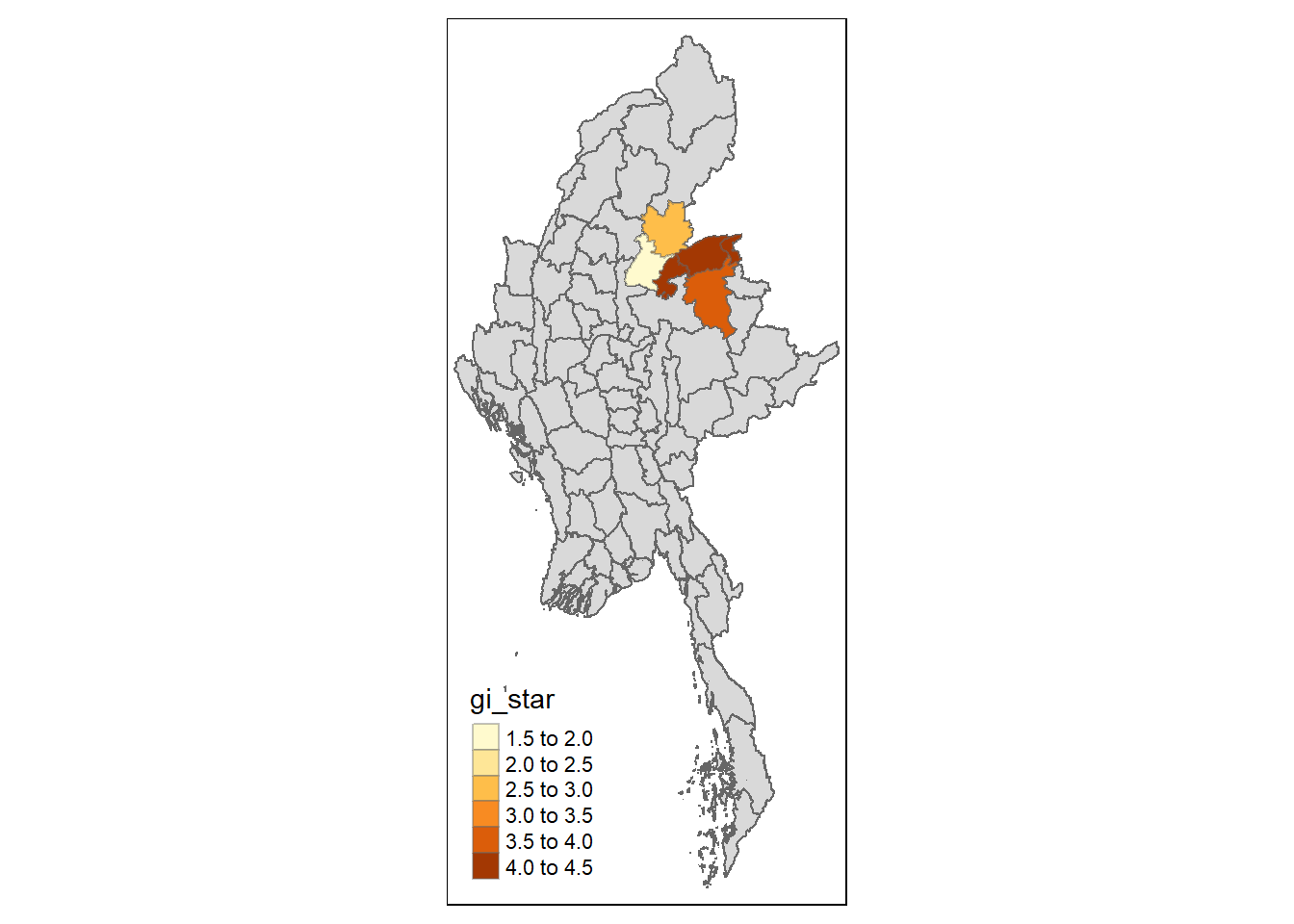 .before = 1)Gi* and local Gi* are distance-based spatial statistics. Hence, distance methods instead of contiguity methods are used to derive the spatial weight matrix.