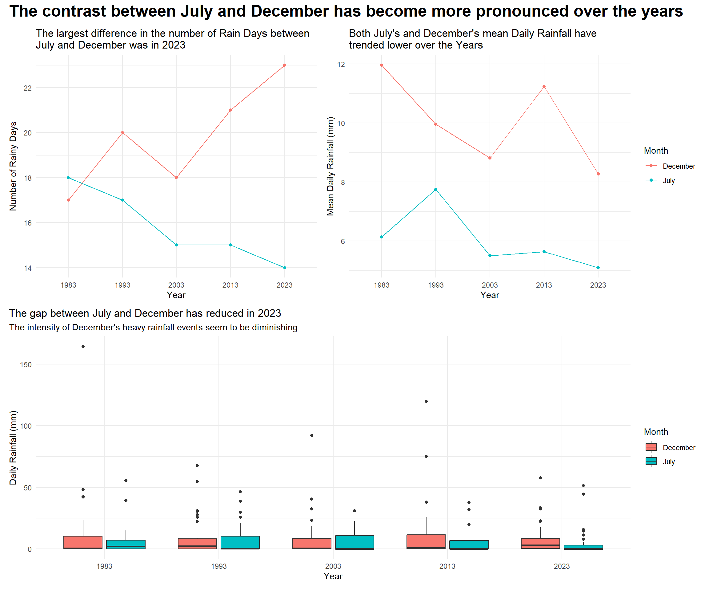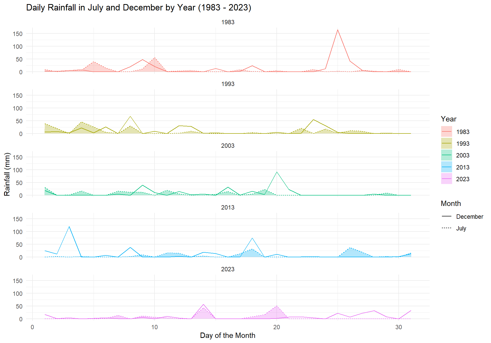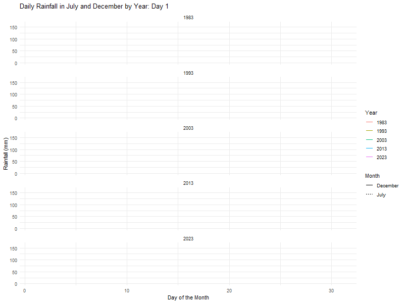 labs(title = "Daily Rainfall in July and December by Year (1983 - 2023)",