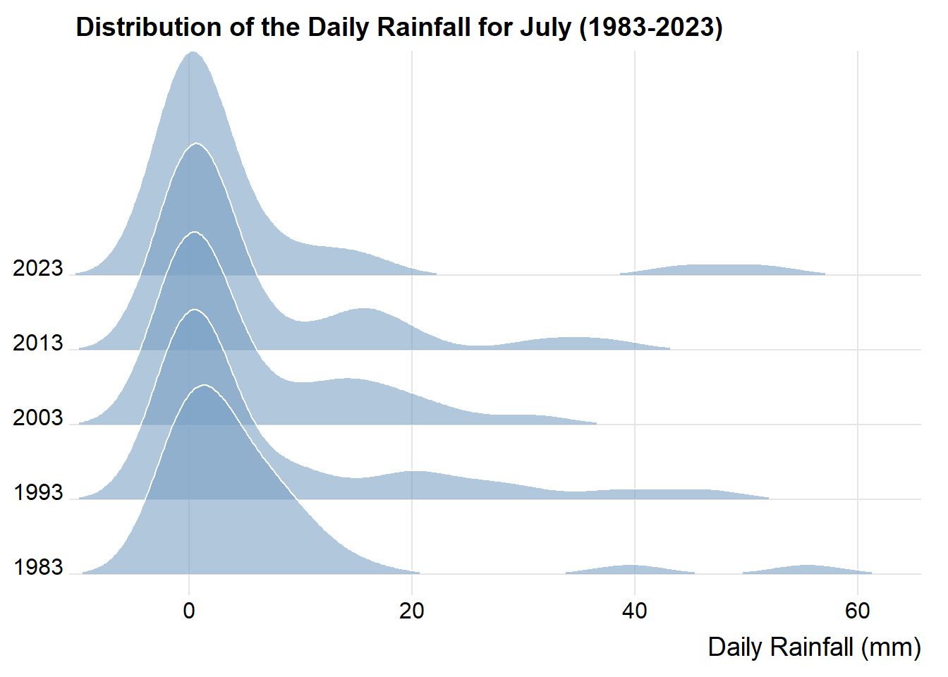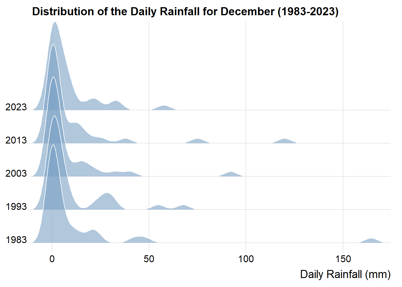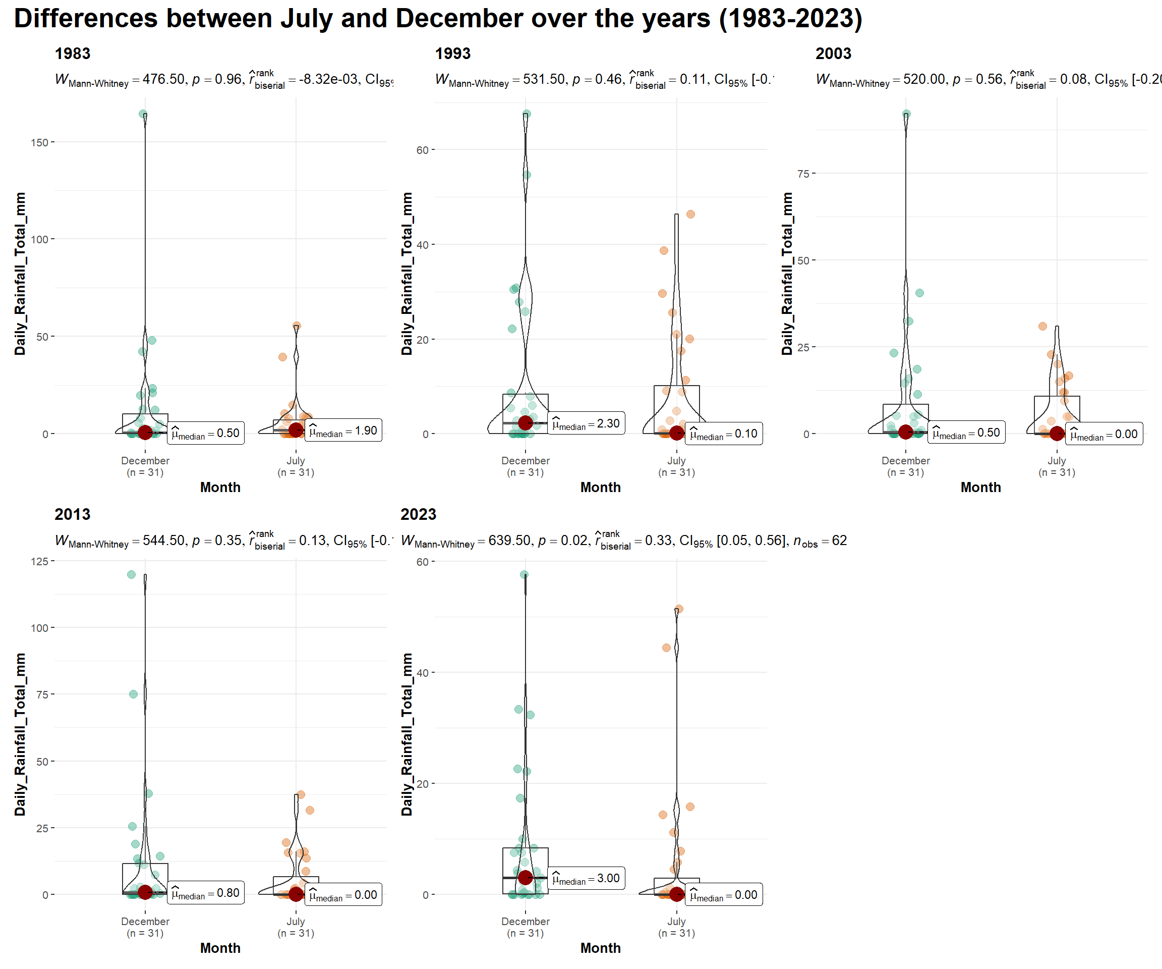 labs(title = "Daily Rainfall in July and December by Year (1983 - 2023)",