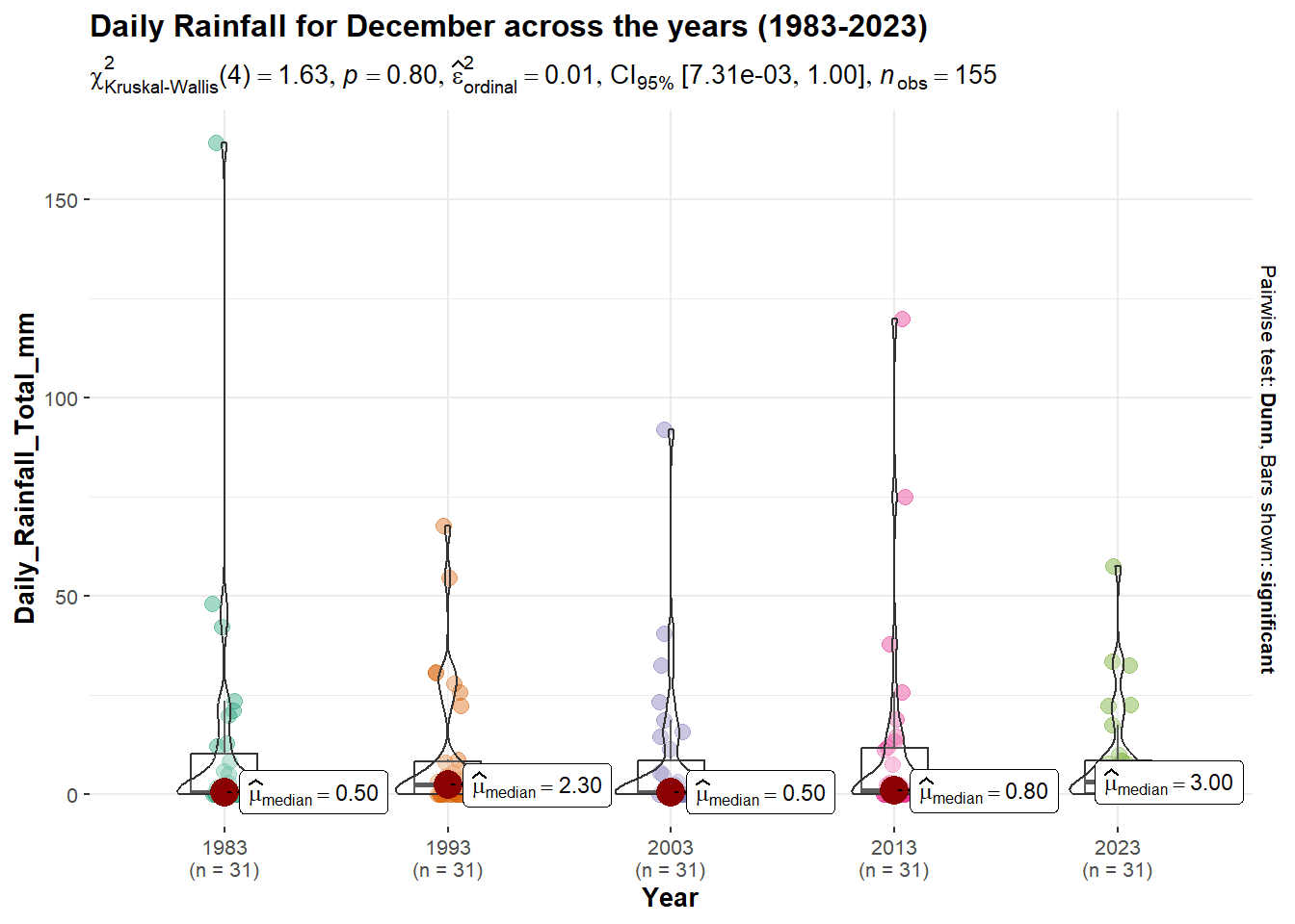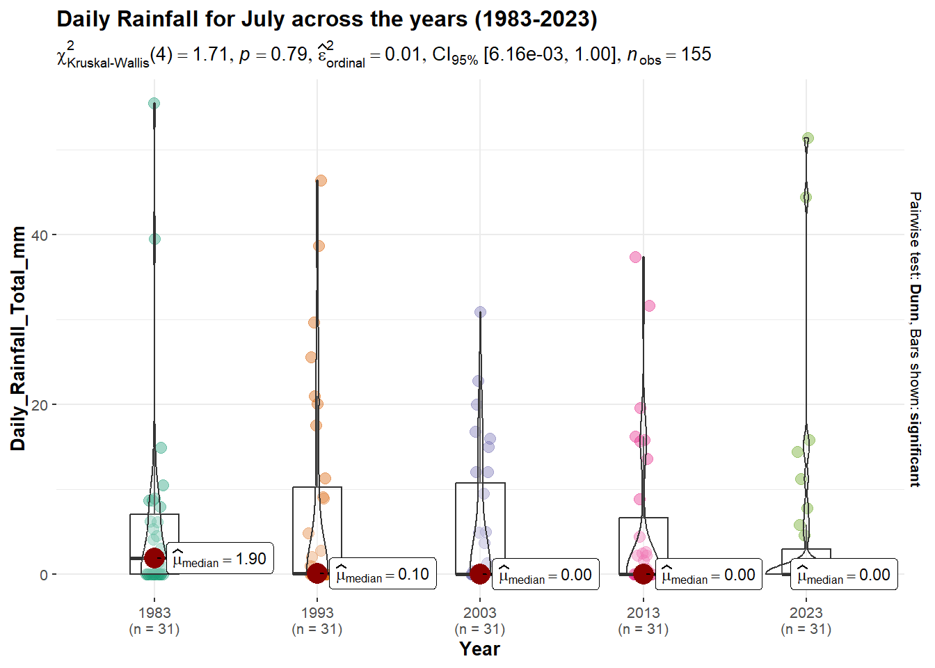 Since we have rain fall data for 5 different years, I will use grouped_ggbetweenstats() from the ggstatplot package.