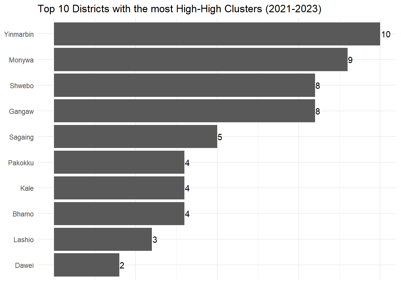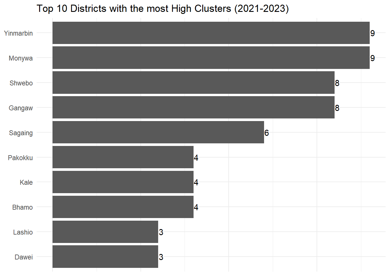 ggtitle("Top 10 Districts with the most High Clusters (2021-2023)") +