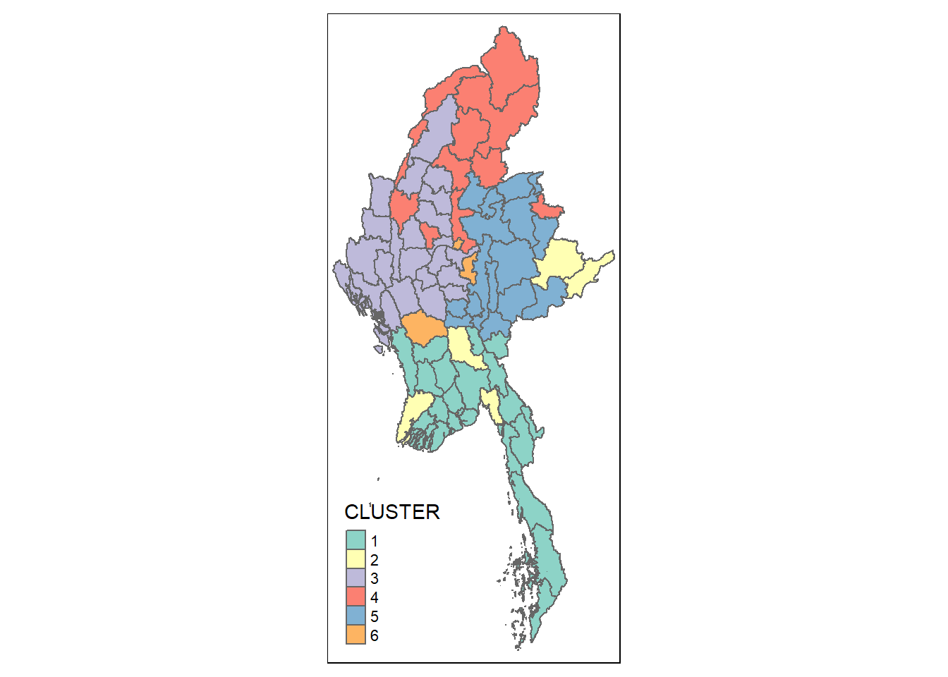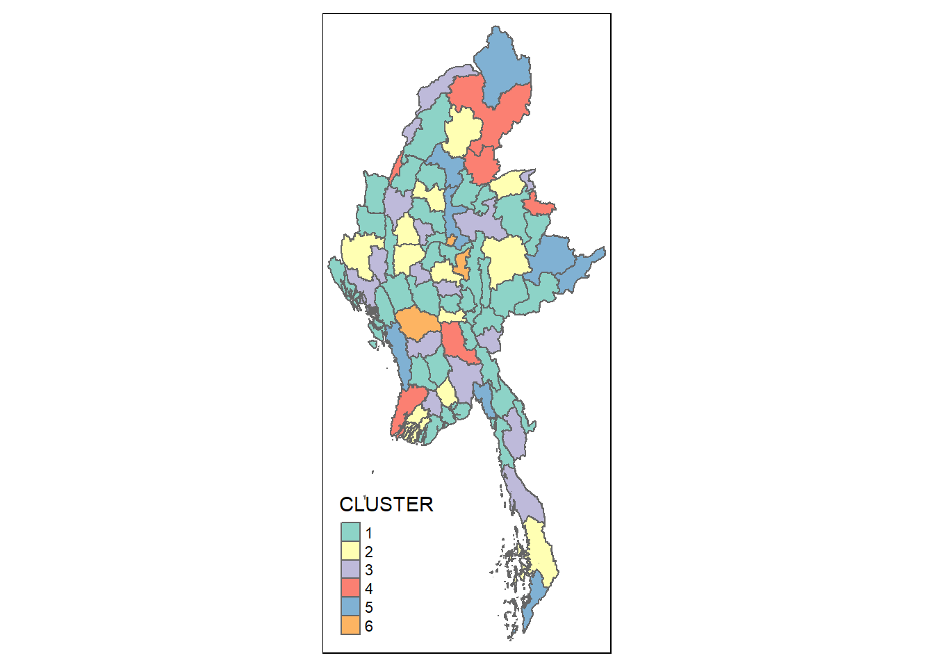 groups <- as.factor(cutree(nongeo_cluster, k=6))myanmar_ngeo_cluster <- cbind(mmr_shp_mimu_2, as.matrix(groups)) %>%