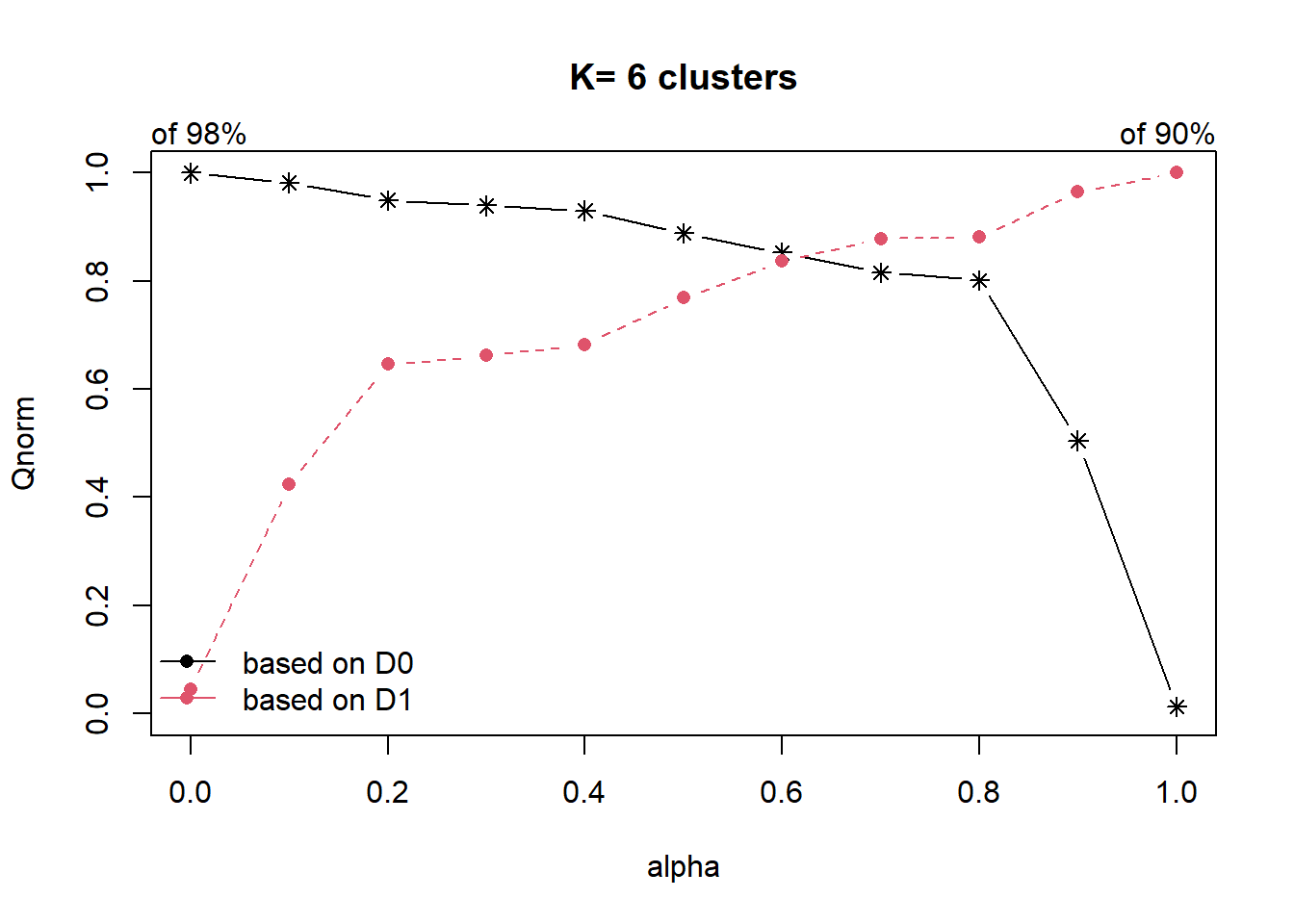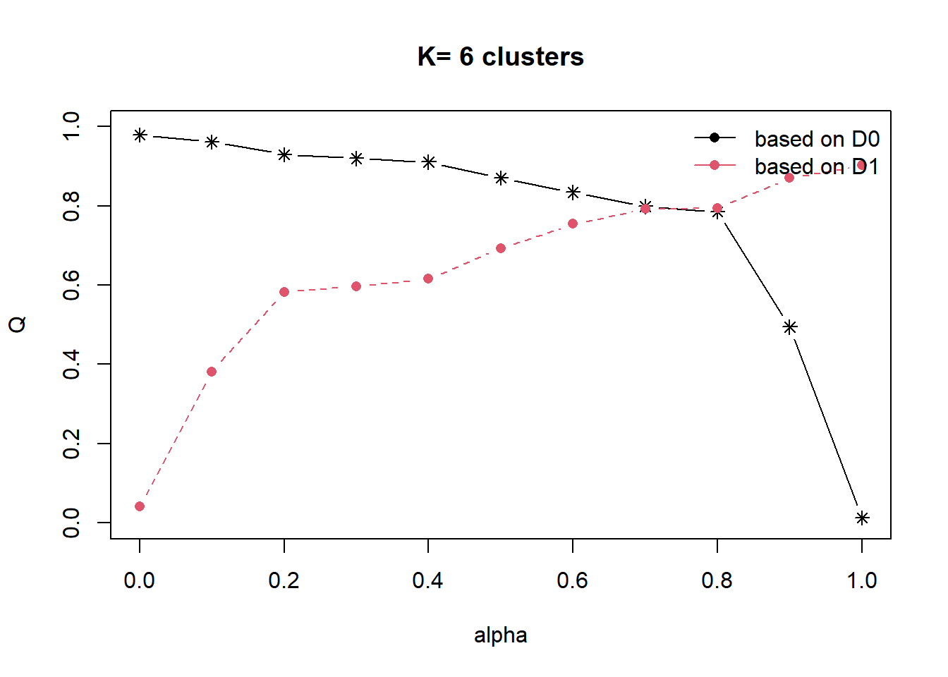 cr <- choicealpha(proxmat, distmat, range.alpha = seq(0, 1, 0.1), K=6, graph = TRUE)